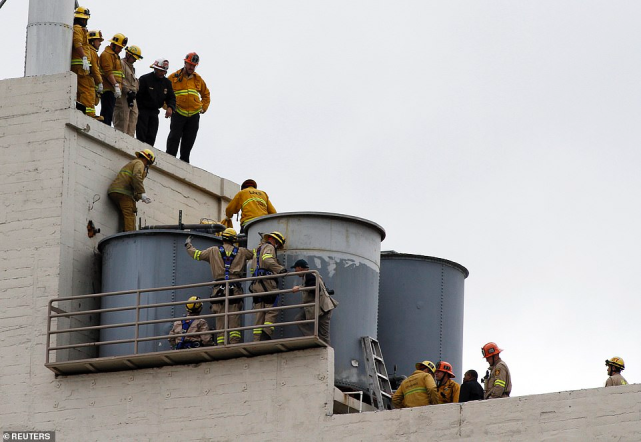 消防员正在转移蓝可儿的尸体后离开酒店。