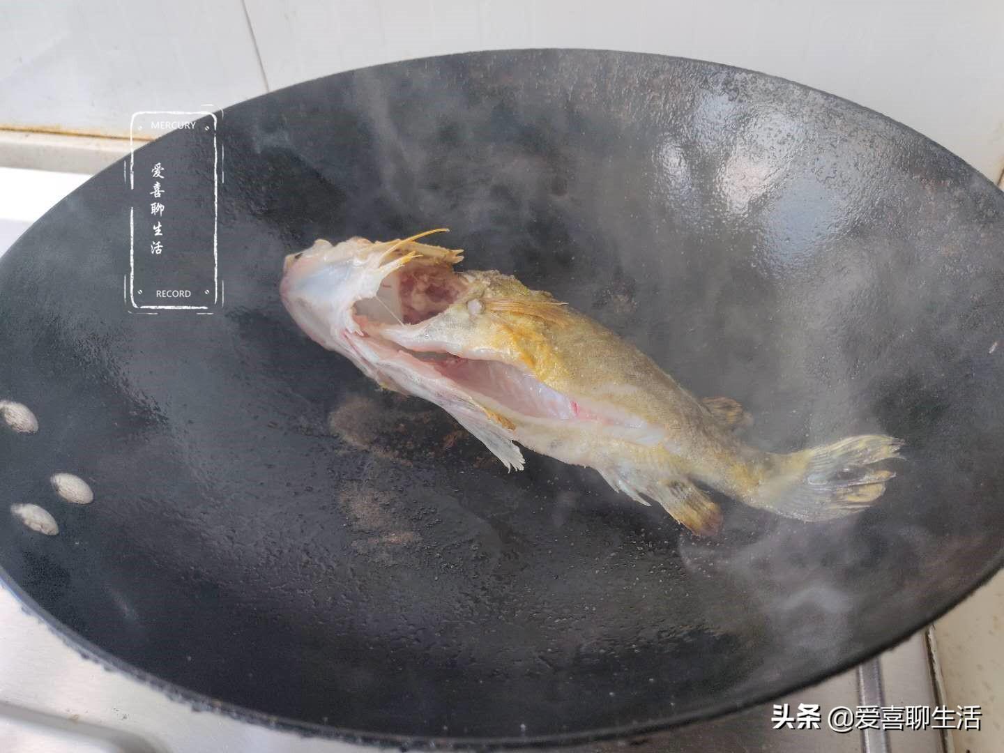 第三步 翻面,鱼放入锅中后不要急着去动它,晃动锅底,轻轻推动鱼身,鱼能动了,再翻面。